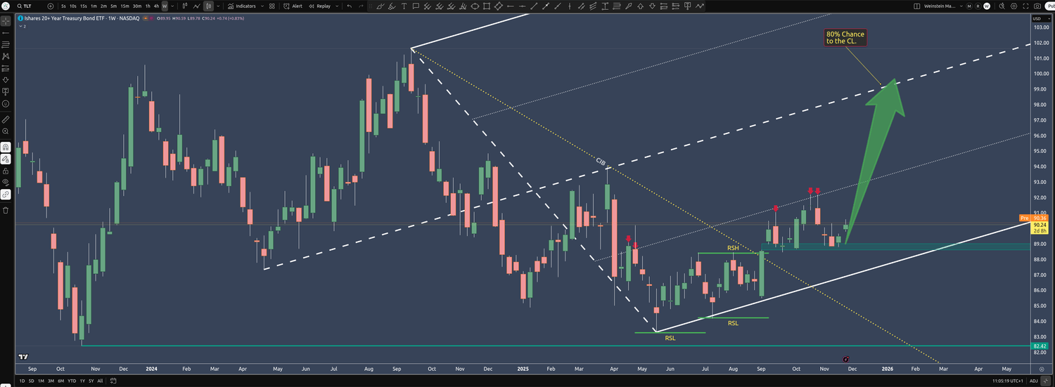 Our statistical probability of hitting the centerline is roughly 80%. That implies we can look for a longer-term play in TLT. However, keep a close eye on the 1/4 line. It isn’t exactly friendly, as the rejections we’ve seen so far make clear.