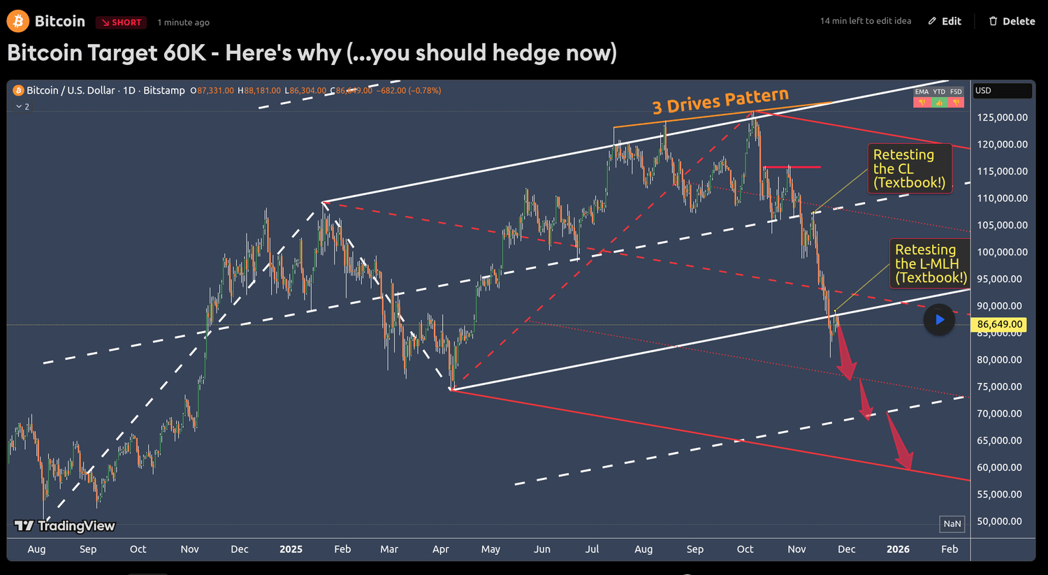 In the past days weโve seen a re-test at the white L-MLH. Bitcoin failed to trade its way back into the fork. That leaves further price losses as the likely outcome.