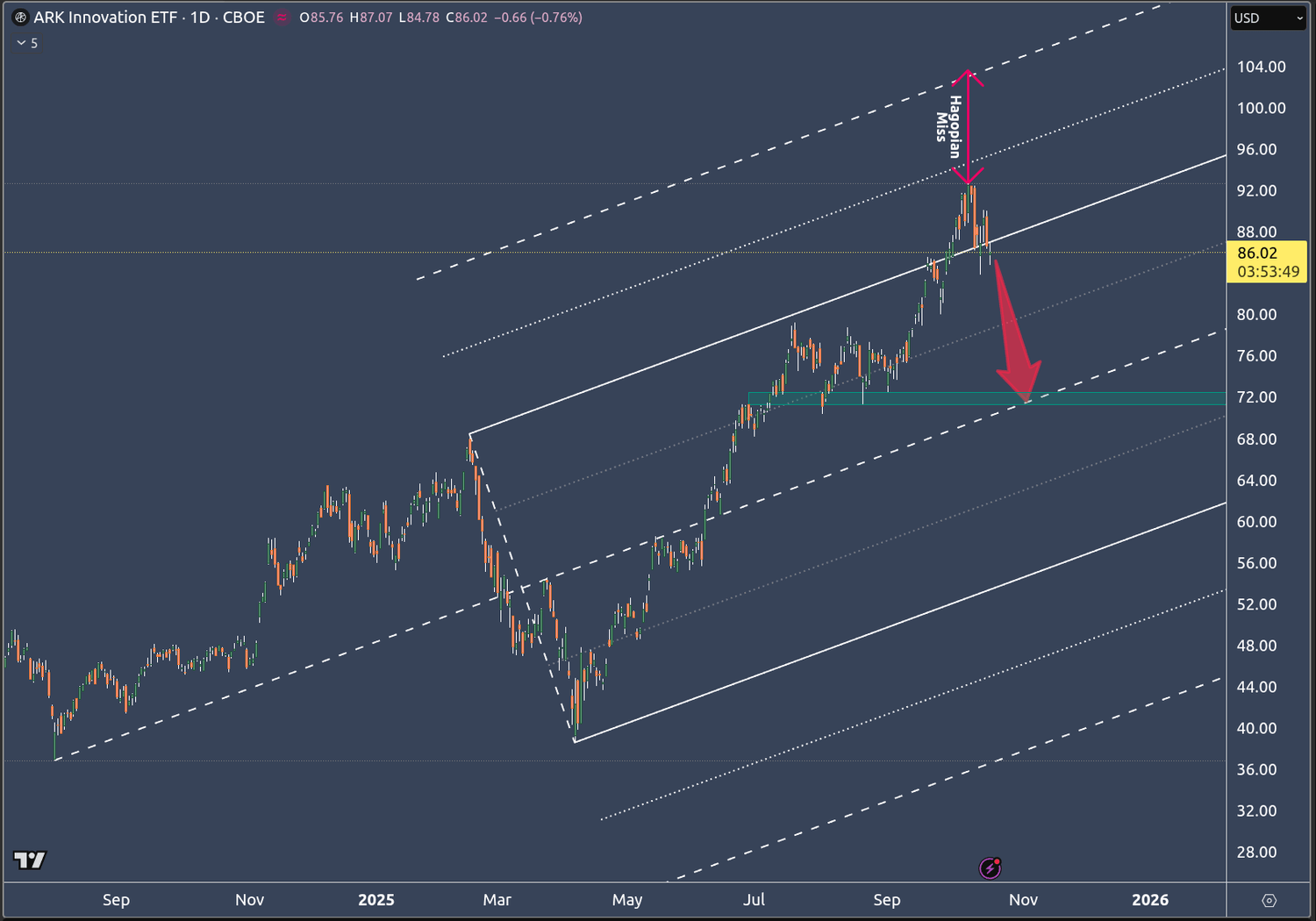 When rates rise, ARKK melts. Its “future profits” vanish faster than smoke in a wind tunnel.